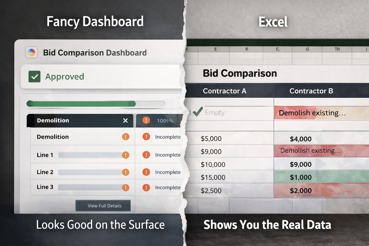 A dashboard can show you a green check mark on a bid even when half the scope items are blank. A clean UI won't flag that two subcontractors defined "demolition" completely differently. The tool presents the data you gave it, packaged up nicely, whether or not that data is any good.